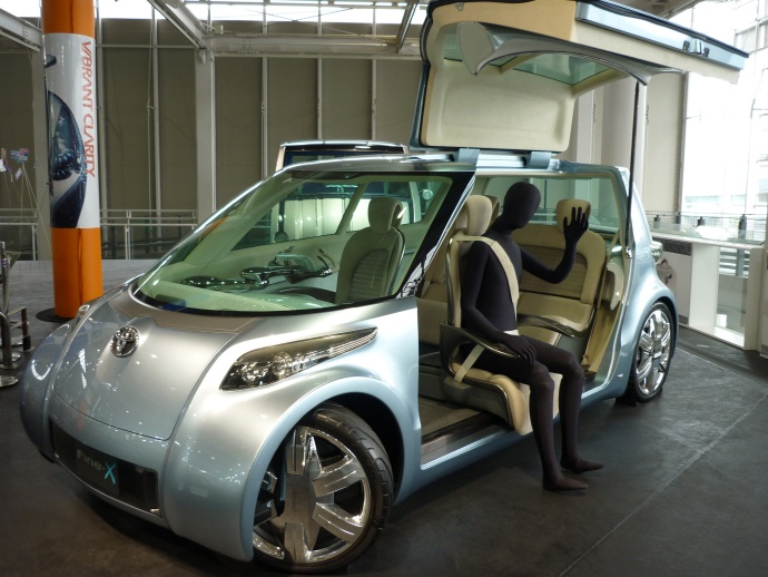 Aujourd’hui je vous enmène de nouveau sur Odaiba mais dans un ensemble de complexes commerciaux. On voulait se reposer donc on n’a bougé que ce matin. Cette après midi on se repose 3 heures avant de repartir pour une virée de nuit en ville! Voici donc le parcours du matin. Ce fut un concentré de bonheur. Une petite pluie (la première depuis notre arrivée) cette nuit a bien rafraichi l’air et ce matin c’est le pied léger qu’on repart non loin de l’hotel au pied de la grande roue. Il y a là bas des centres commerciaux et on voulait voir à quoi ça ressemblait. Dès notre arrivée sur place on entre dans le « complexe Toyota ». On y trouve pas mal de modèles dont la pluspart ne sont pas en France (dommage les voitures sont belles). Mais on est attiré vers un autre spectacle: les voitures automatiques! Celles qui se conduisent toutes seules! Et…. oui on l’a fait! là je ne peux vous mettre que les photos mais rassurez vous on a tout filmé! Comme c’est une condute automatique j’ai pu sans trop de frayeur laisser Karen passer côté chauffeur. C’est super marrant de voir le volant bouger tout seul. Ca allait pas bien vite mais c’était fun. Le tour en voiture coûte 200 yen par personne. Les voitures sont des petits modèles style IQ. J’ai eu un peu de mal à entrer dedans puis y caser mon sac à dos…mais bon, le trajet était pas trop long.